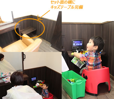 キッズテーブルが完備しているセット面が2台あるので、お子さんをお連れの方は、お子さんの目の届く場所で、ヘアスタイルづくりを安心して楽しむことが出来ます。(対象年齢は、3才からとなります。それ以下のお子様の場合は、一度、電話でお問い合わせ下さい)